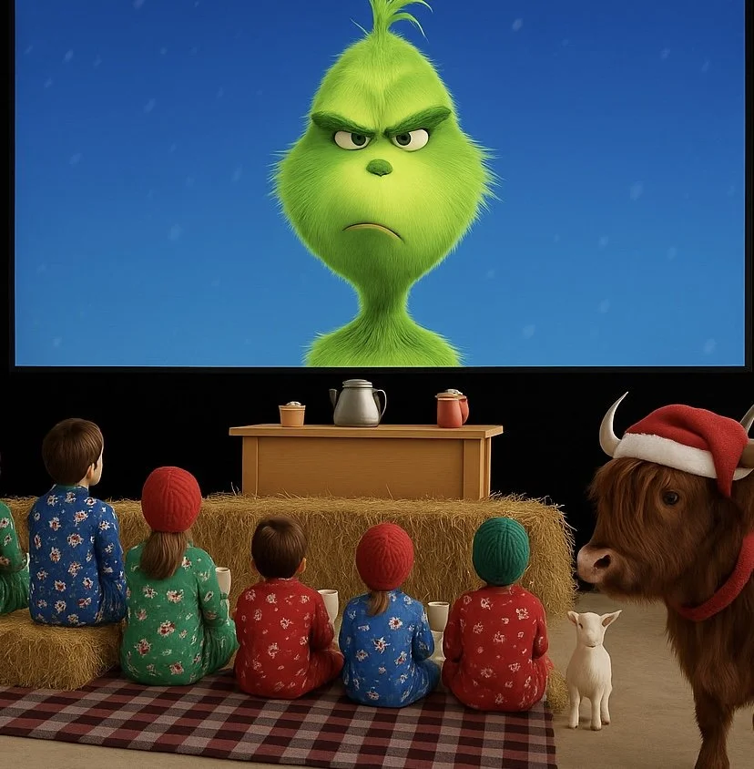 Join us inside the barn for a cozy Christmas evening with hot cocoa, popcorn, and our friendly animals β all while watching The Grinch (Animated, 2018) on the big screen!
